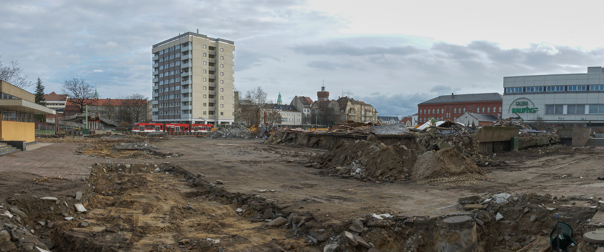 Abriss, Backstein, Baustelle, Cottbus, DDR, Fußgängerbrücke, Galeria Kaufhof, Kosmos, Panorama, Pavillons, Stadtpromenade, Sternchen, Theaterschule