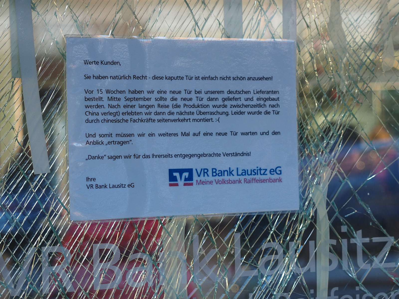 - Bank, China, Defekt, Glasscheibe, Globalisierung, reparatur, Tür, Vandalismus, Zerstörung