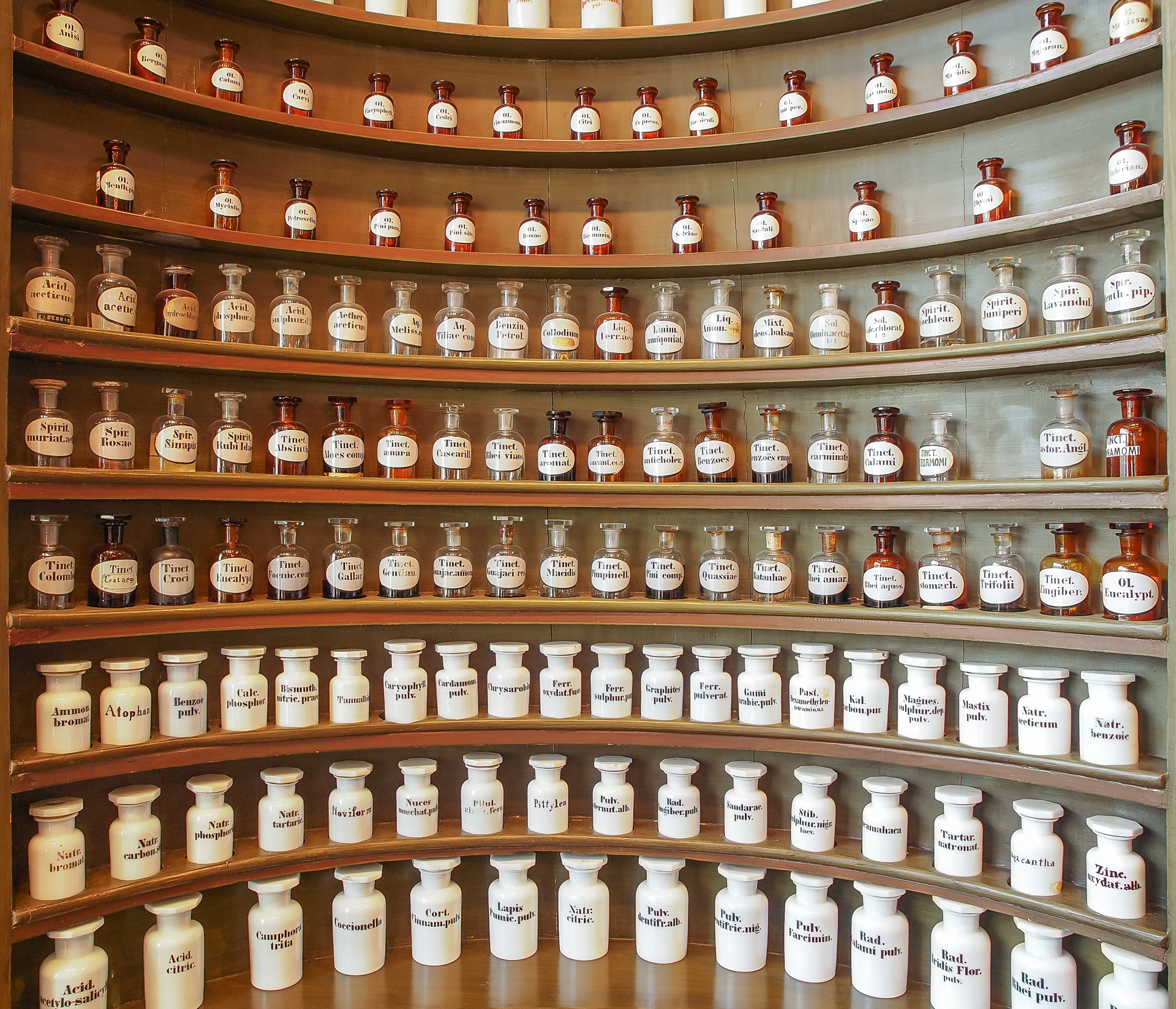 Apothe, Apothekenmuseum, Flaschen, Gläser, Medikamente, Mixtur, Pillen, Pulver, Regal, Rezeptur, Salbe