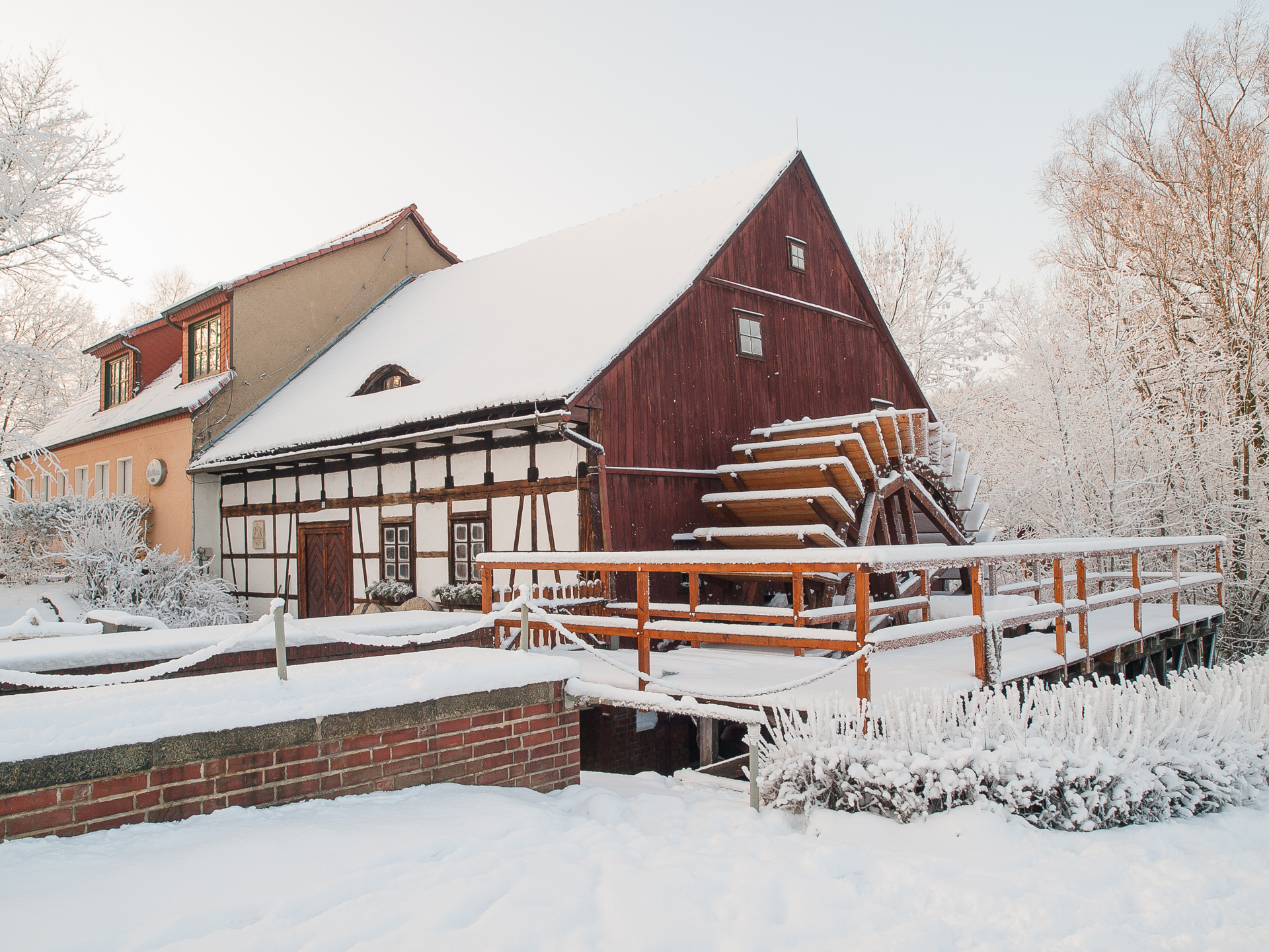 - 2009, braun, Cottbus, Denkmalschutz, Fachwerk, Mühle, Mühlenrad, Schnee, Spree, spreewehrmühle, Technisches Denkmal, Wasserrad, weiß, Winter