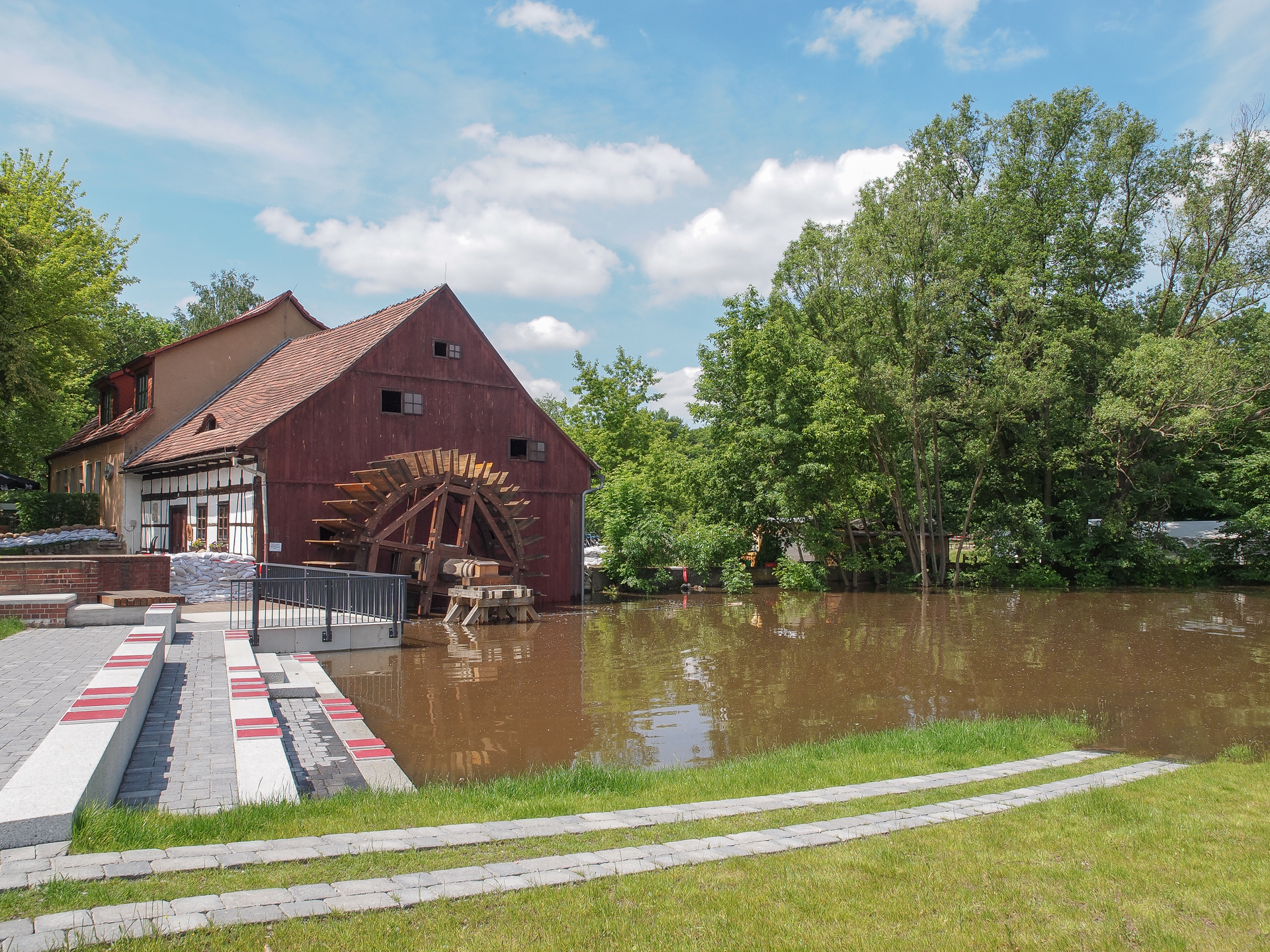 - 2013, Cottbus, Denkmalschutz, Fachwerk, Fluss, Flut, Hochwasser, Mühlenrad, sandsack, sandsäcke, Spree, spreewehrmühle, Überschwemmung