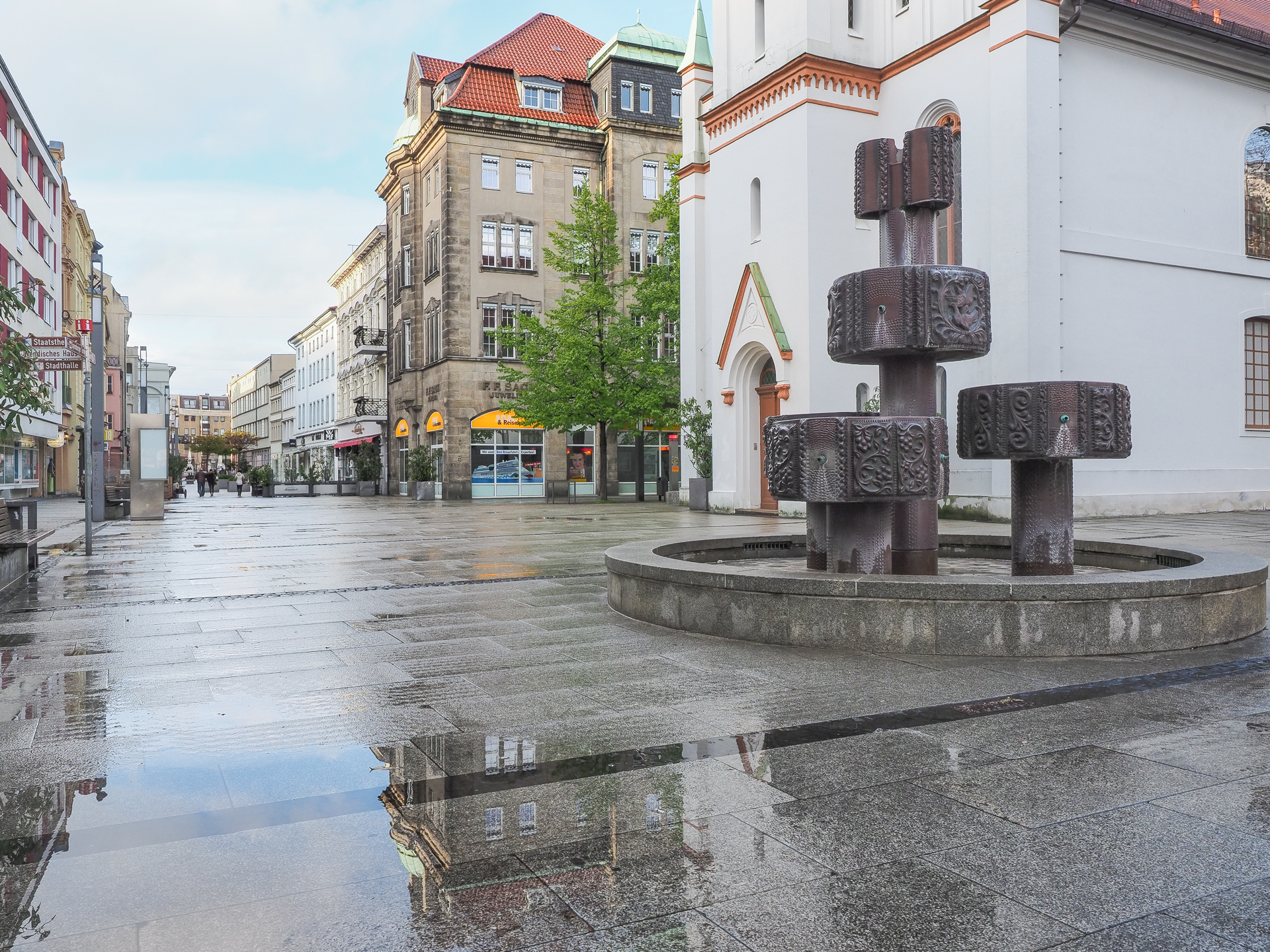 - ADAC, Brunnen, Cottbus, Jüdische Gemeinde, Juwelier Sack, pfütze, Regen, Sorbenbrunnen, Spiegelung, Sprem, Spremberger Straße, Synagoge