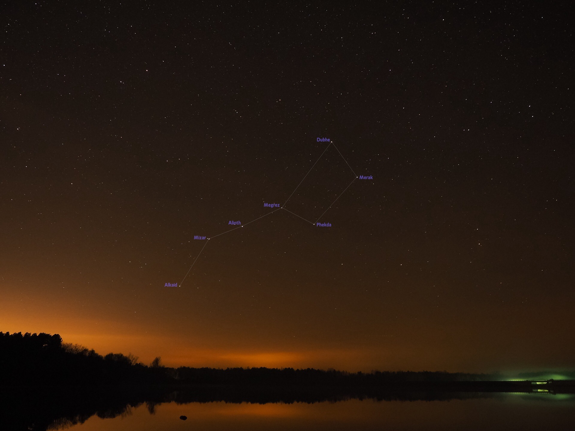 Der "Große Wagen" über dem Spremberger Stausee. Im Hintergrund, rechts unten, die Staumauer.