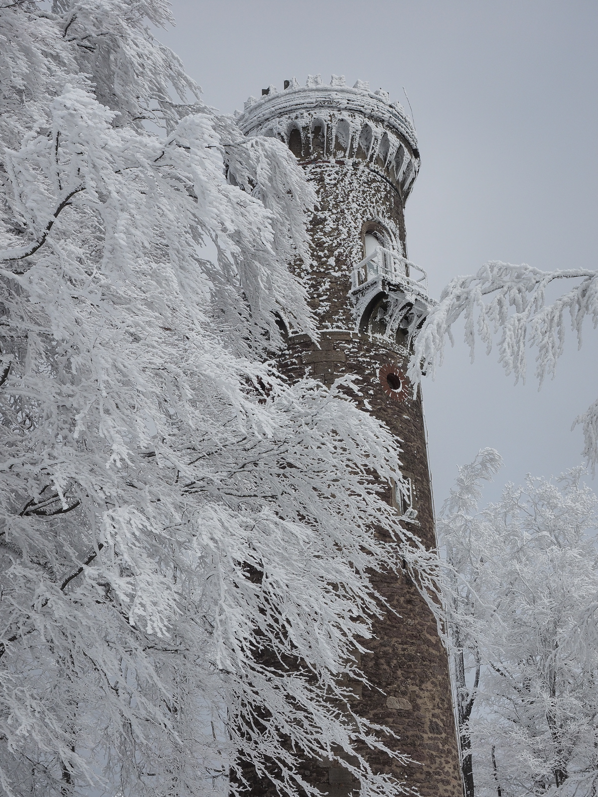 Blick hinauf zum Kickelhahn Turm, vorbei an herrlich vereisten Bäumen