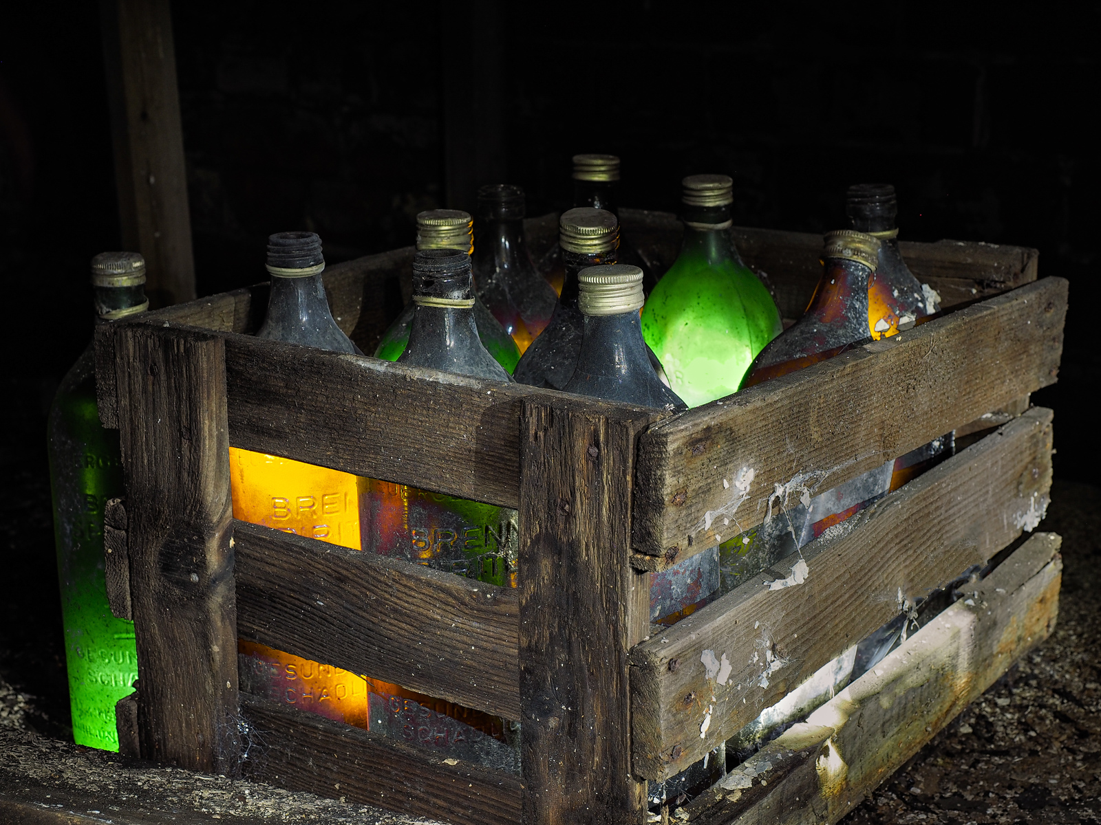 Alte, staubige Holzkiste, mit leeren Glasflaschen.