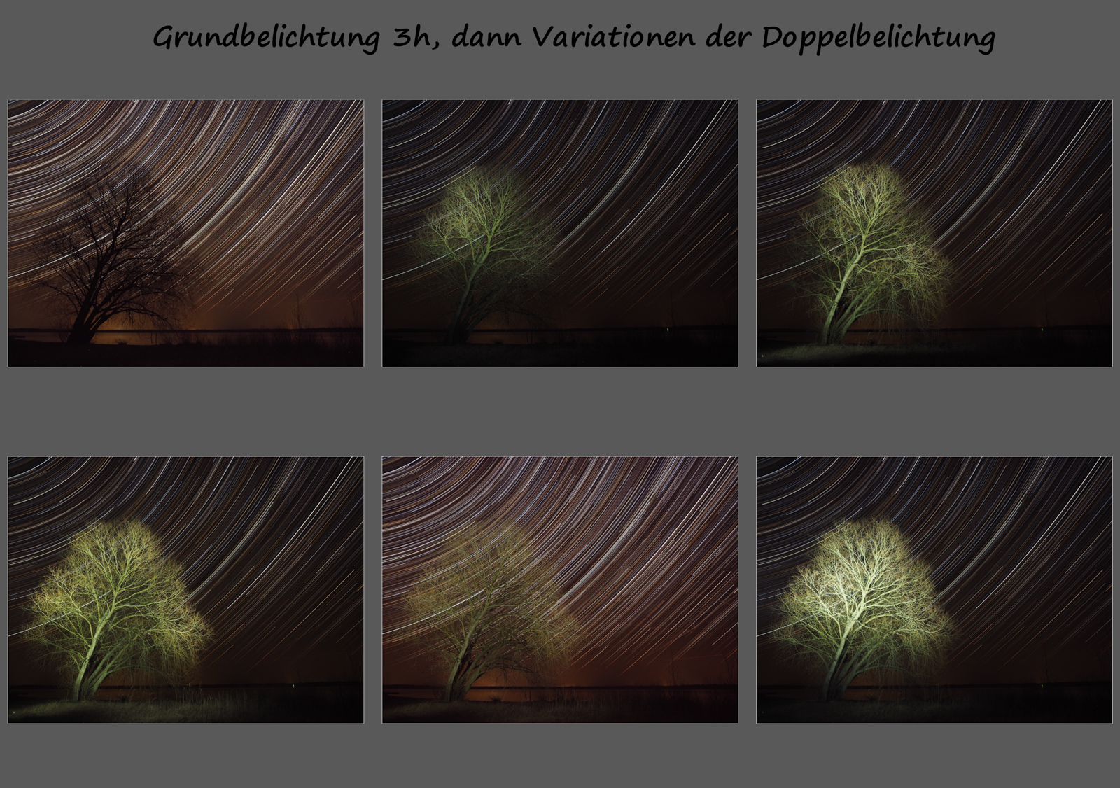 Doppelbelichtungen. Basis war eine 3h Belichtung ohne den Baum im Vordergrund zu beleuchten. Dann folgten nur noch die Doppelbelichtungen, welche für das "abpinseln" des Baumes mit der Taschenlampe 10-20 Sekunden in Anspruch genommen hat. Das Ergebnis war eine Langzeitbelichtung mit zusätzlichen Variationen der Beleuchtung im Vordergrund.