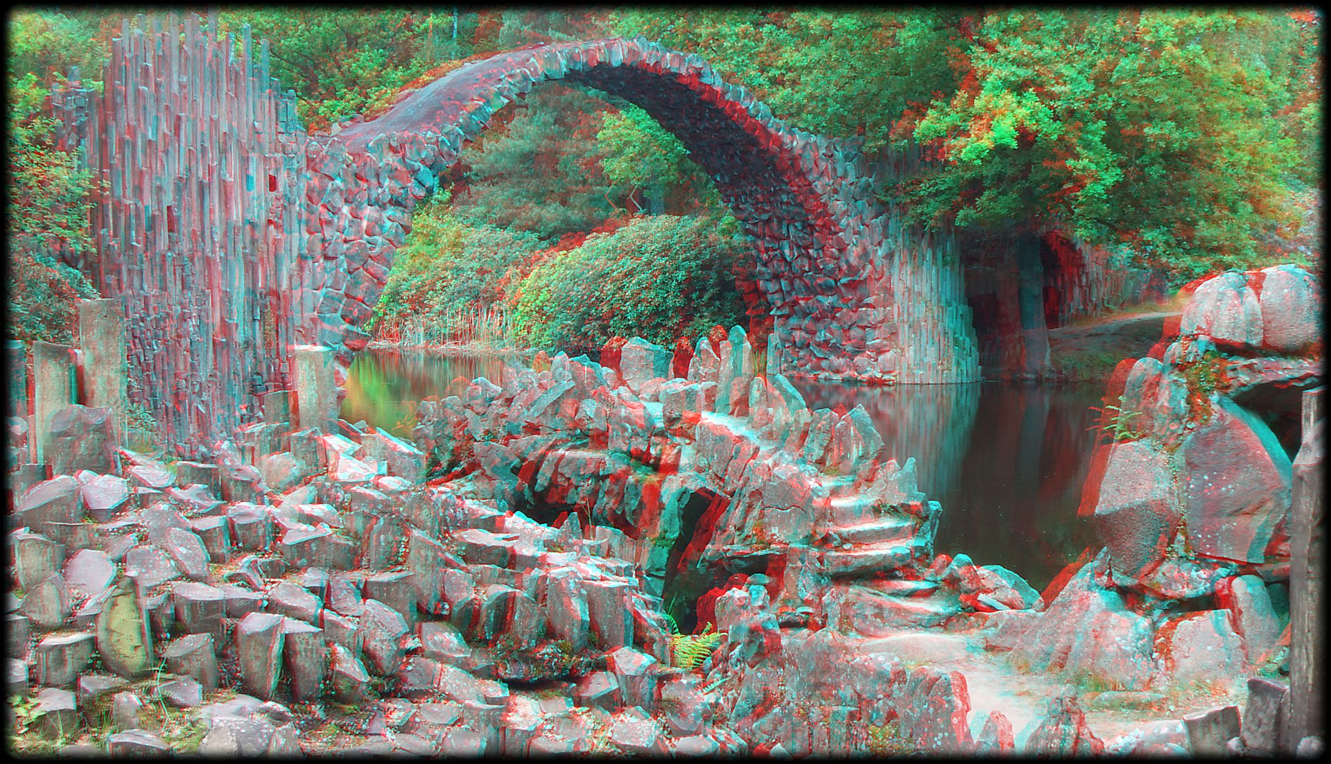 - 3D, Anaglyphen, Basalt, Brücke, Fuji Real 3D W3, Kromlau, Kromlauer Park, Rakotz, See, Stereo, Wasser