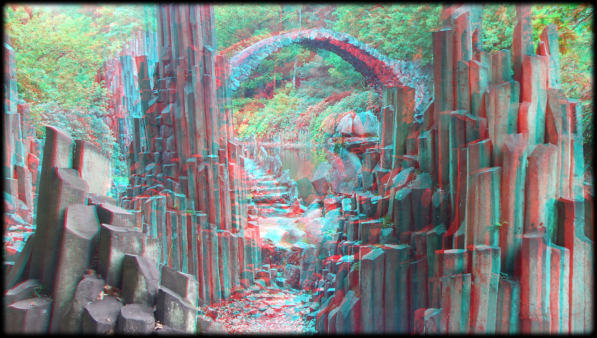 - 3D, Anaglyphen, Basalt, Brücke, Fuji Real 3D W3, Kromlau, Kromlauer Park, Rakotz, See, Stereo, Wasser
