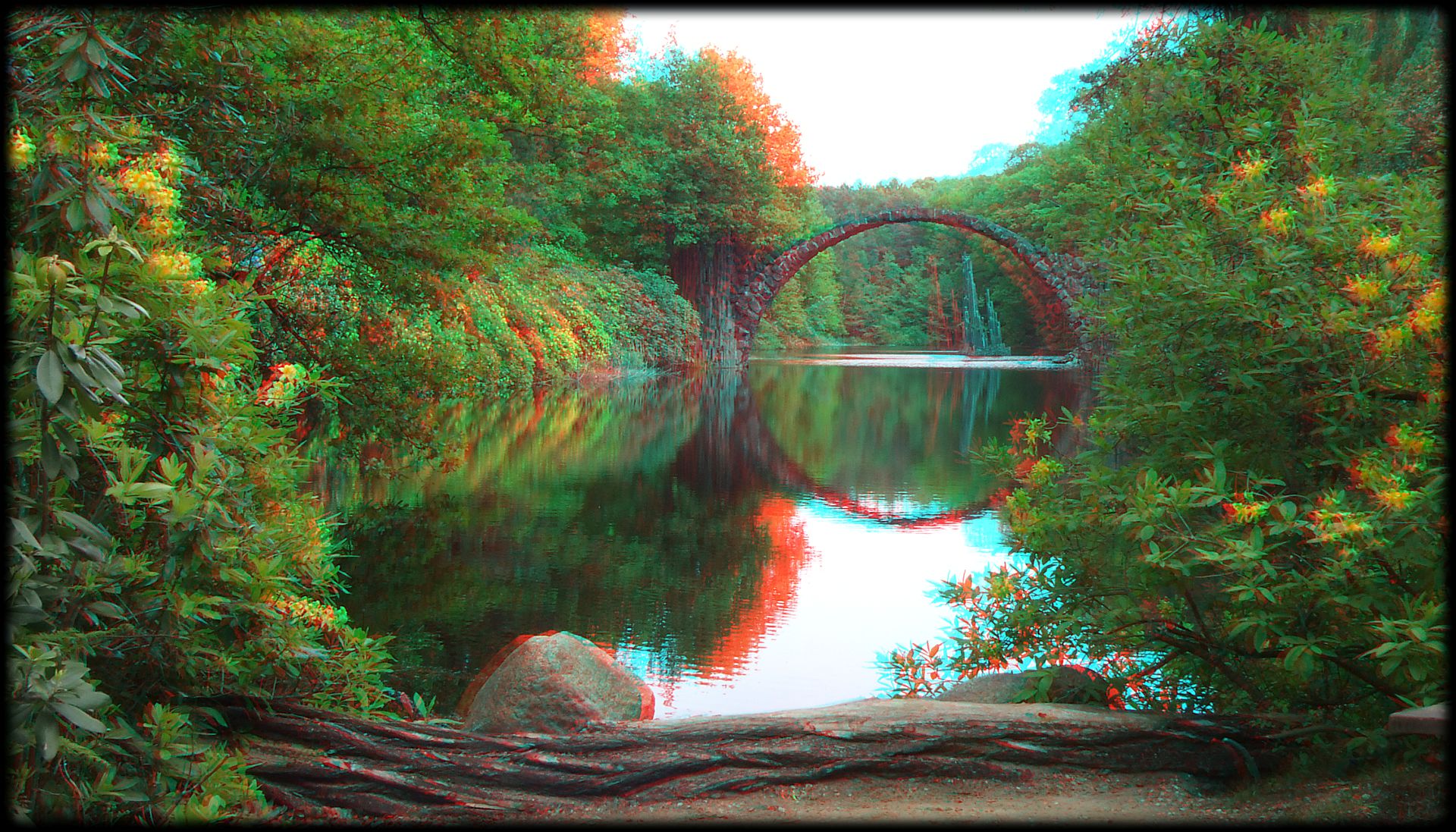 - 3D, Anaglyphen, Brücke, Fuji Real 3D W3, Kromlau, Kromlauer Park, Rakotz, See, Stereo, Wasser