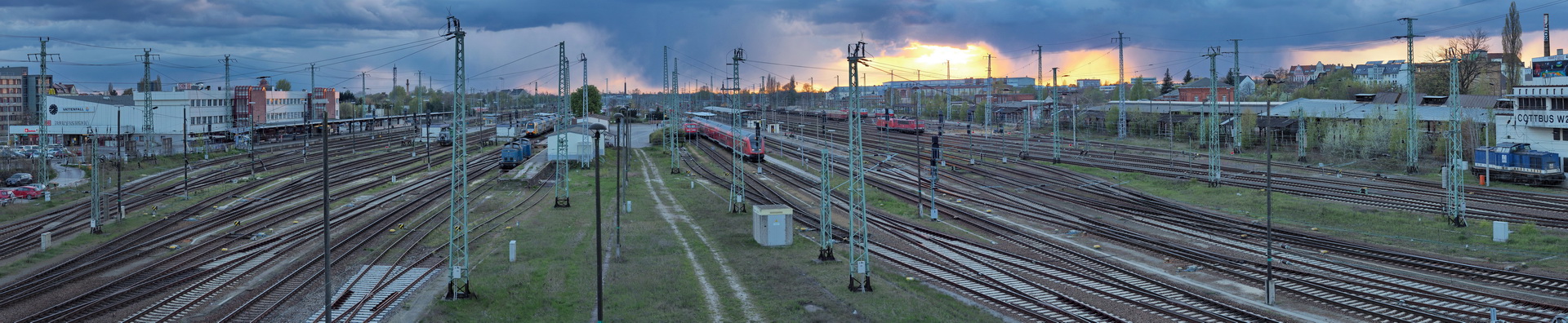 - Bahn, Bahnhof, Cottbus, Eisenbahn, Licht, Panorama, Schiene, Schienen, Sonnenuntergang, Stimmung, Wolken