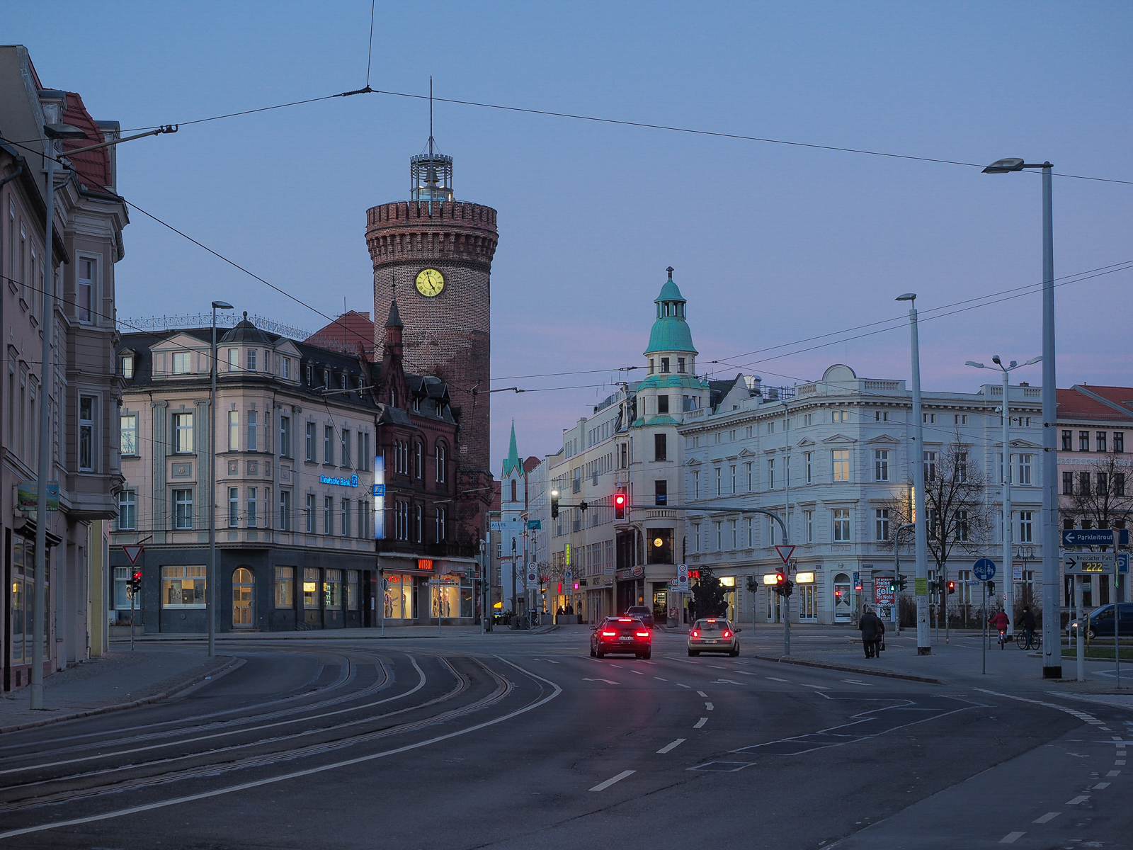 Blick auf den Spremberger Turm und die Spremberger Straße "Sprem", entlang dem Breitscheidplatz aus der Strraße der Jugend, Höhe Hauptsparkasse. Bei abendlicher Stimmung.