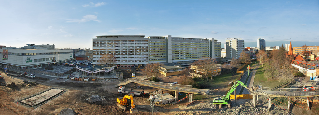 Blick auf die Stadtpromenade und die Baustelle. Gerade wird die Brücke abgerissen.