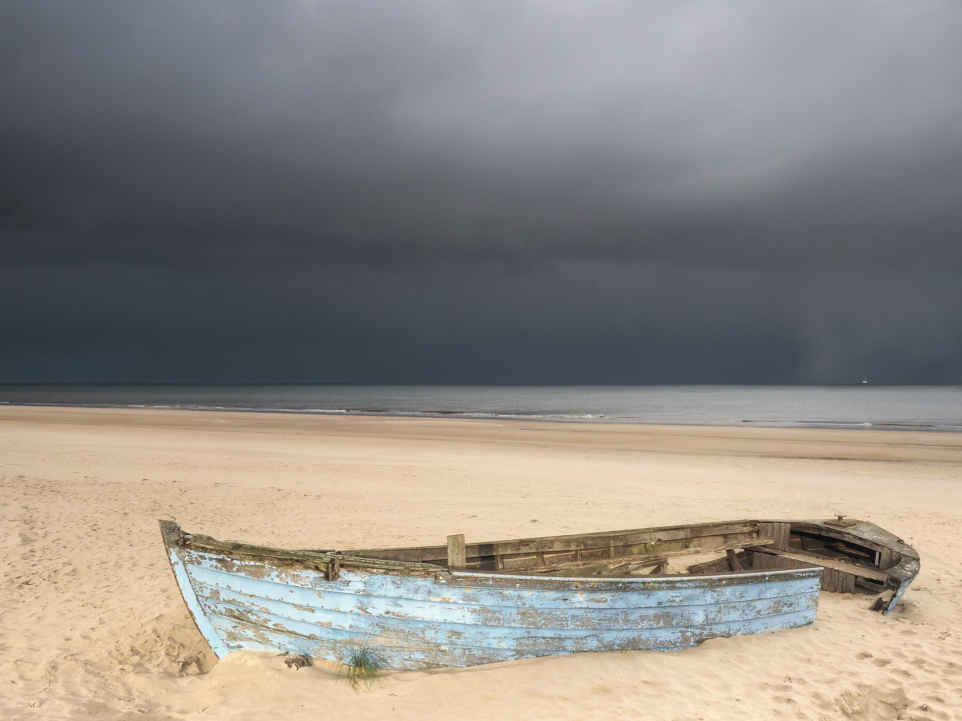 alt, antik, Boot, Draußen, Dunkel, Fischerboot, grau, Hell, Herbst, Kahn, Kontrastarm, Licht, Meer, Ostsee, Reisen, Sand, Stimmung, Strand, Ungesättigt, Unwetter, Wolken